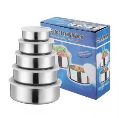Elevate your food storage game with this versatile 5-piece stainless steel container set. Each round container features a secure, leak-resistant lid that creates an airtight seal to keep your ingredients fresh and flavorful for longer. The durable stainless steel construction ensures these containers can handle daily use while maintaining their pristine appearance. Perfect for storing dry goods, leftovers, or meal prep ingredients, this set offers various sizes to accommodate different storage needs. The practical round design makes it easy to stack, store, and retrieve items from your pantry or refrigerator. These containers are ideal for organizing your kitchen essentials, from grains and legumes to prepared meals and snacks. The sleek, modern appearance adds a touch of sophistication to your kitchen storage, while the functional design prioritizes convenience and practicality. Keep your food organized and fresh with this reliable storage solution that combines style with functionality.