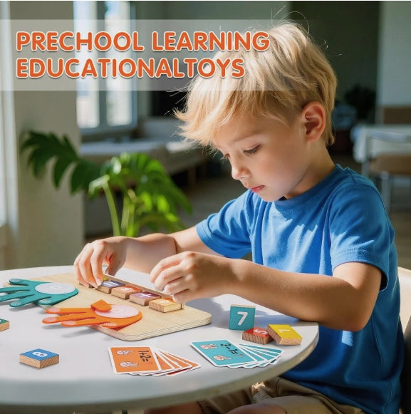 This wooden finger arithmetic toy is a fun and interactive way for young children to learn basic math skills. It features two colorful hand-shaped counters and number blocks that kids can use to practice addition and subtraction. The hands-on design encourages active learning and helps develop early math skills. The toy can be used flat or standing upright, offering versatile play options. It's a great educational tool to make learning math enjoyable for preschoolers and early elementary students. The set includes number blocks and cards with example problems to guide learning.